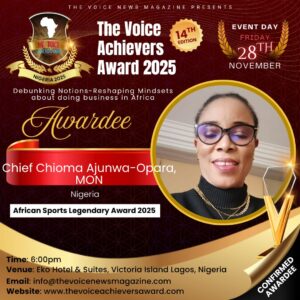 Chief Chioma Ajunwa- opara MON, Founder of Chioma Ajunwa Foundation will be awarded the prestigious African Sports Legendary Awards of 2025 by the Voice Achievers Award. The presentation and other activities of this glamorous event will take place on