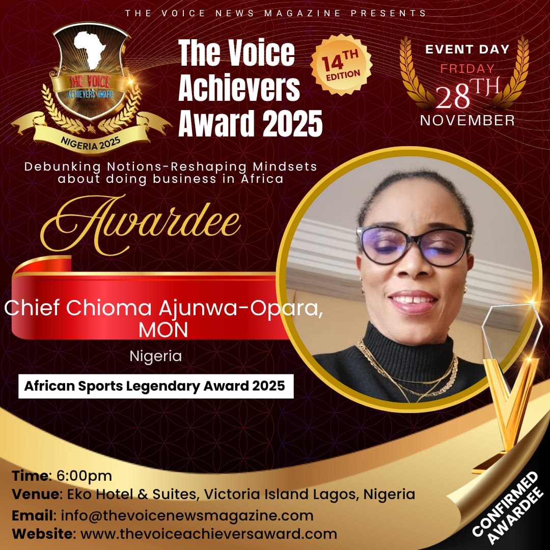Chief Chioma Ajunwa- opara MON, Founder of Chioma Ajunwa Foundation will be awarded the prestigious African Sports Legendary Awards of 2025 by the Voice Achievers Award.